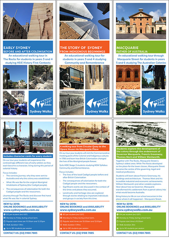 Excerpts from a series of brochures for Sydney Walks detailing the assorted educational walks on offer.