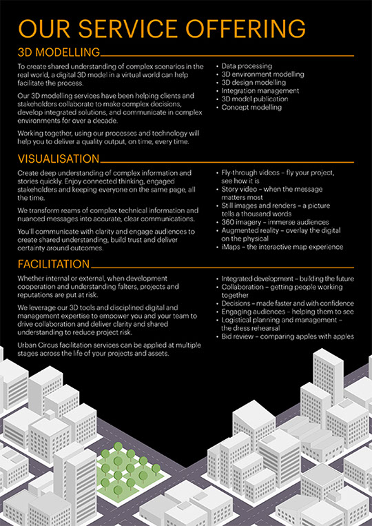 Excerpts from a business profile brochure for a city modelling and visualisation company.