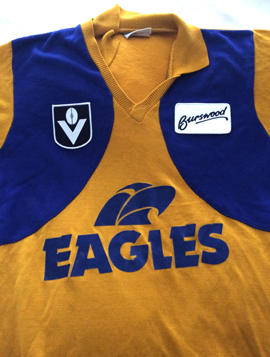 Restoration of a vintage West Coast Eagles guernsey from the 80s. Previously missing logos were redrawn digitally referencing photographs, patches machine embroidered and stitched back onto the top.