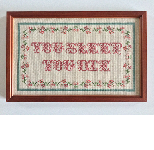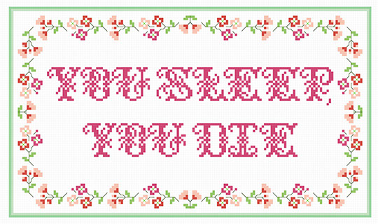Design and realisation of a cross stitch artwork based upon a friend's unintentionally erroneous/hilarious rephrasing of the idiom 'You Snooze, You Lose'.